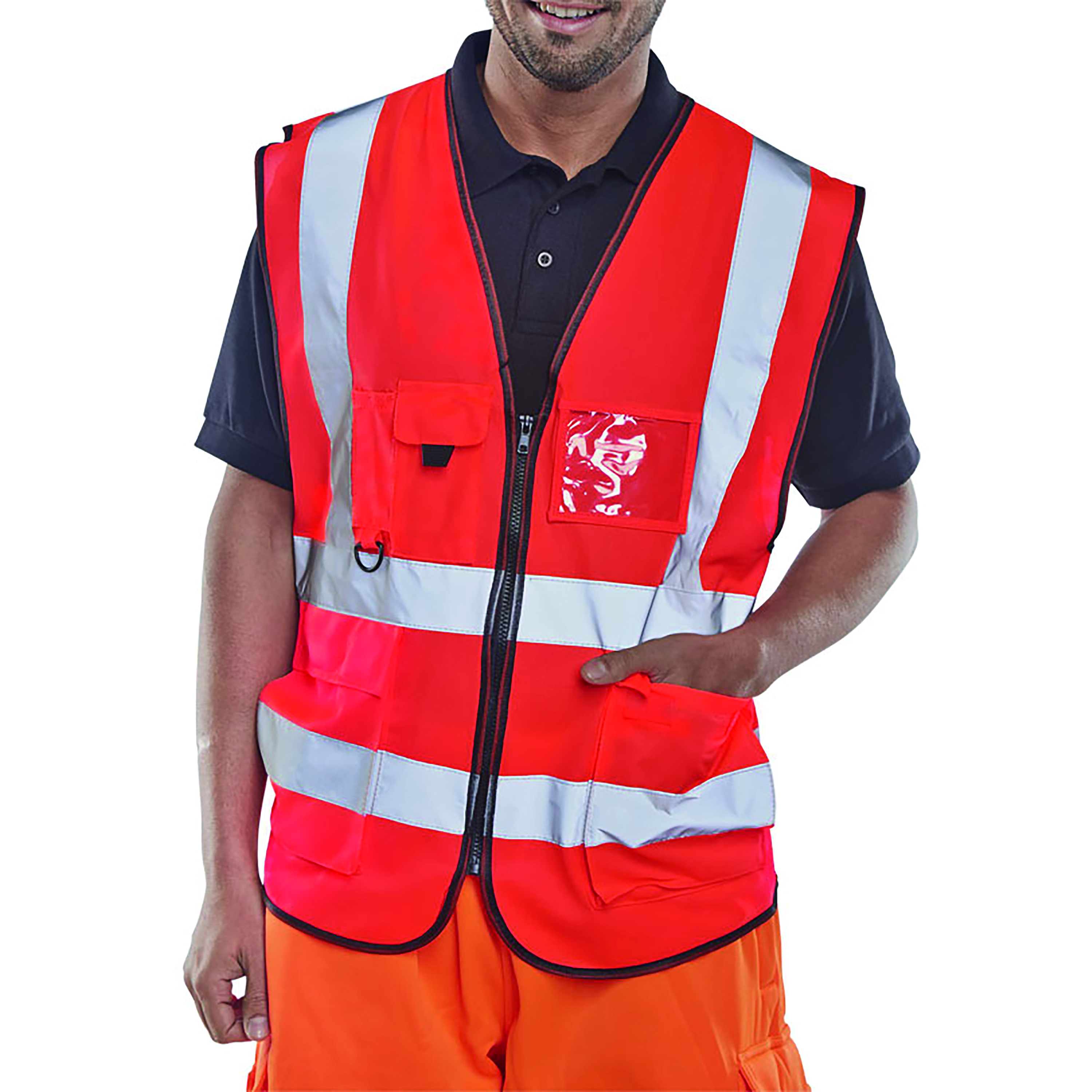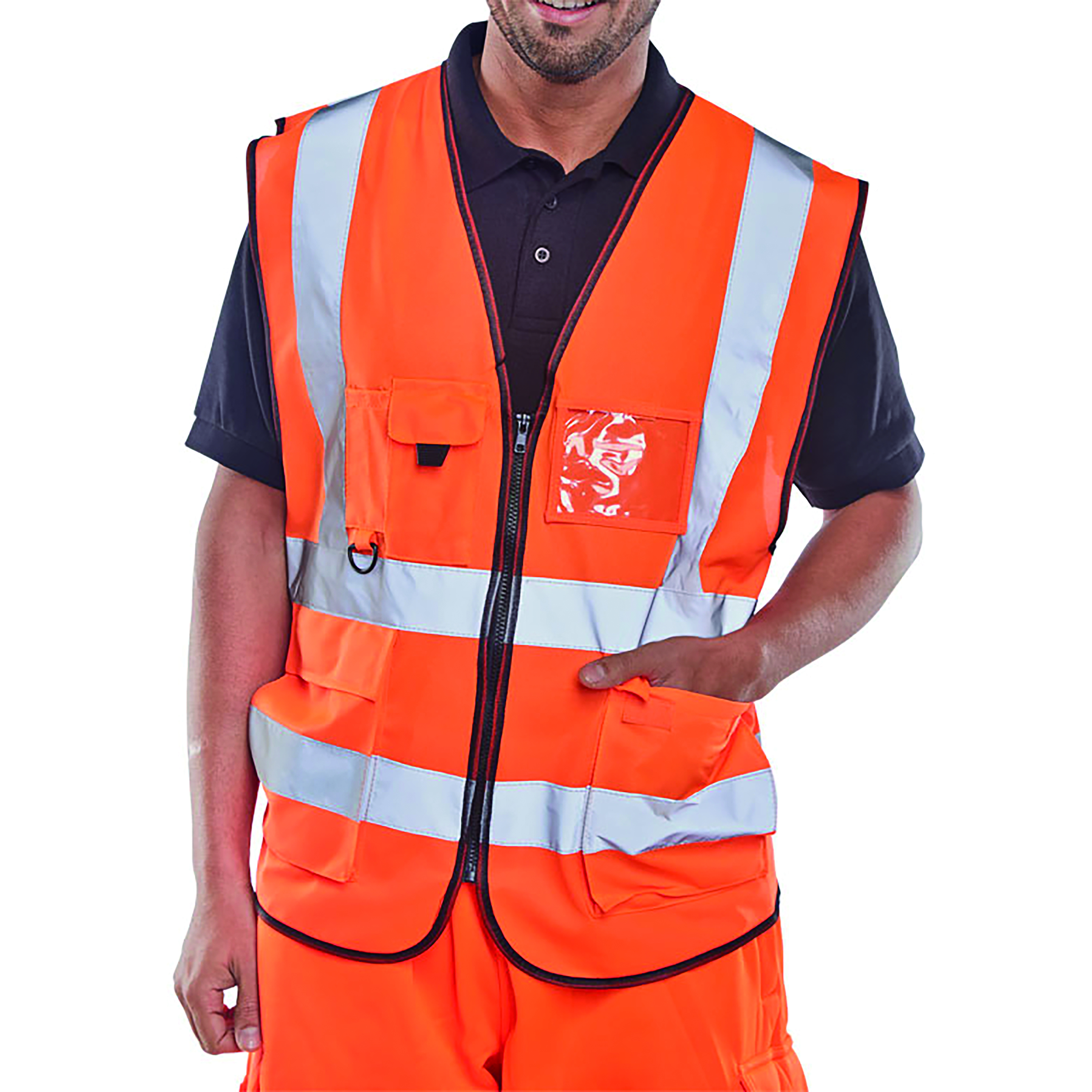 * Saturn yellow Hi Vis executive waistcoat* 100% Polyester* Front zip fastening* Two large front pockets with flaps* Mobile phone pocket with hook and loop fastening flap* Radio loop* Pen & pencil pockets* Transparent ID pouch pocket* Retro-reflective tape* Covered mesh back panel* EN ISO 20471 Class 2 high visibility