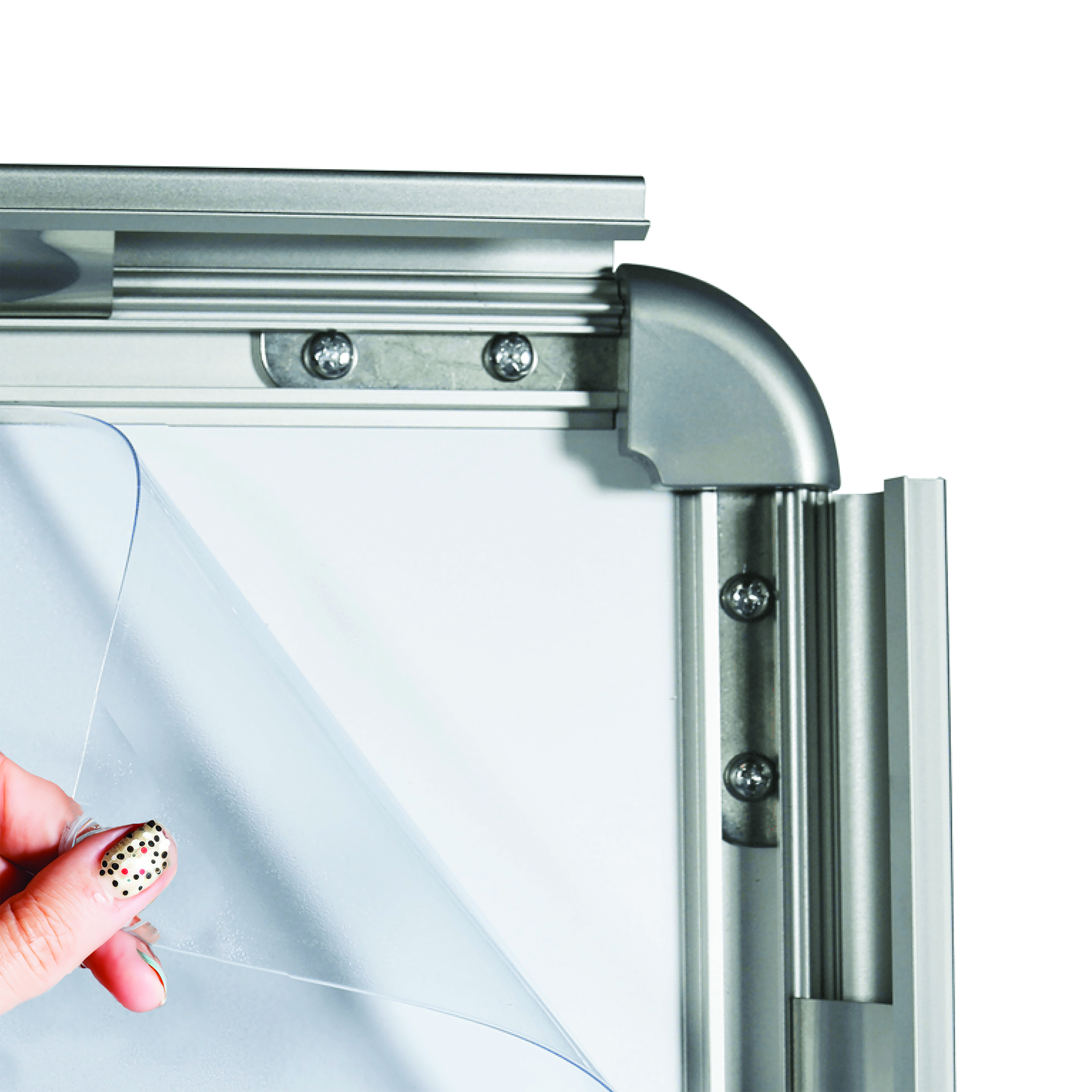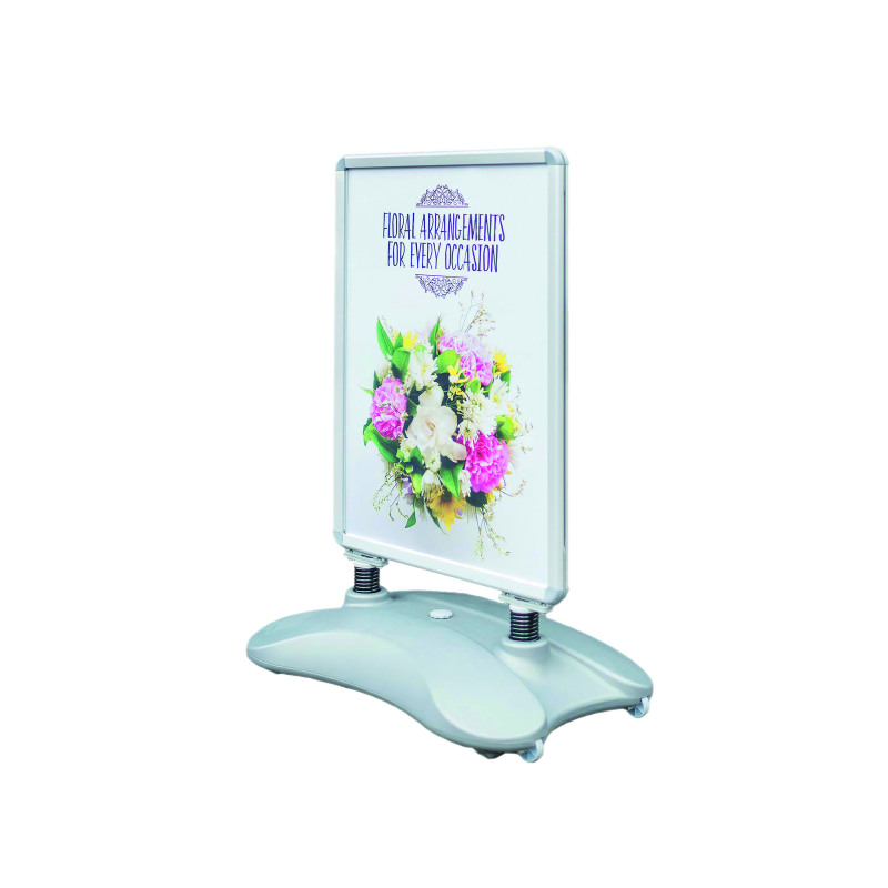 This A1 pavement or forecourt sign is perfect for outdoor or indoor use. Its heavy duty curved plastic base has a filler cap through which you add water to act as ballast. Two springs connect to base to the frame so that excess wind force can be dissipated. A1 silver snap frame provides double sided display of your pavement advertising. Posters (not supplied) can be changed easily by opening up the frame border - no tools required. The attractively curved base has wheels and also incorporates a handle to make moving it simple and easy to be wheeled in at night.