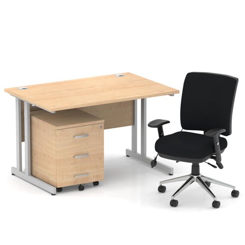 Impulse contract desk | 25mm tops | Heat resistant melamine finish | 18mm modesty panel | Double strut legs | Steel to steel fixings | Impulse mobile pedestal | Steel handles | Smooth running castors for mobility | Lockable drawers | Solid drawer construction | Chiro medium chair | Posture chair – UK Chiropractic Doctor approved | Height adjustable back and seat | Pump lumbar support | Triple lever independent mechanism | Independent seat and backrest tilt angle adjustment | Gas lift tested up to 150kg | Usage: Task 24/7