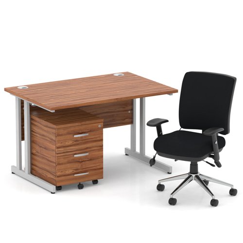 Impulse 1200mm Straight Office Desk Walnut Top Silver Cantilever Leg with 3 Drawer Mobile Pedestal and Chiro Medium Back Black